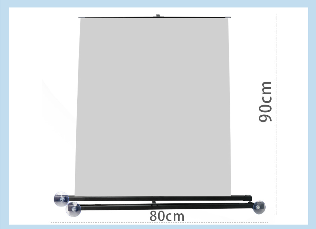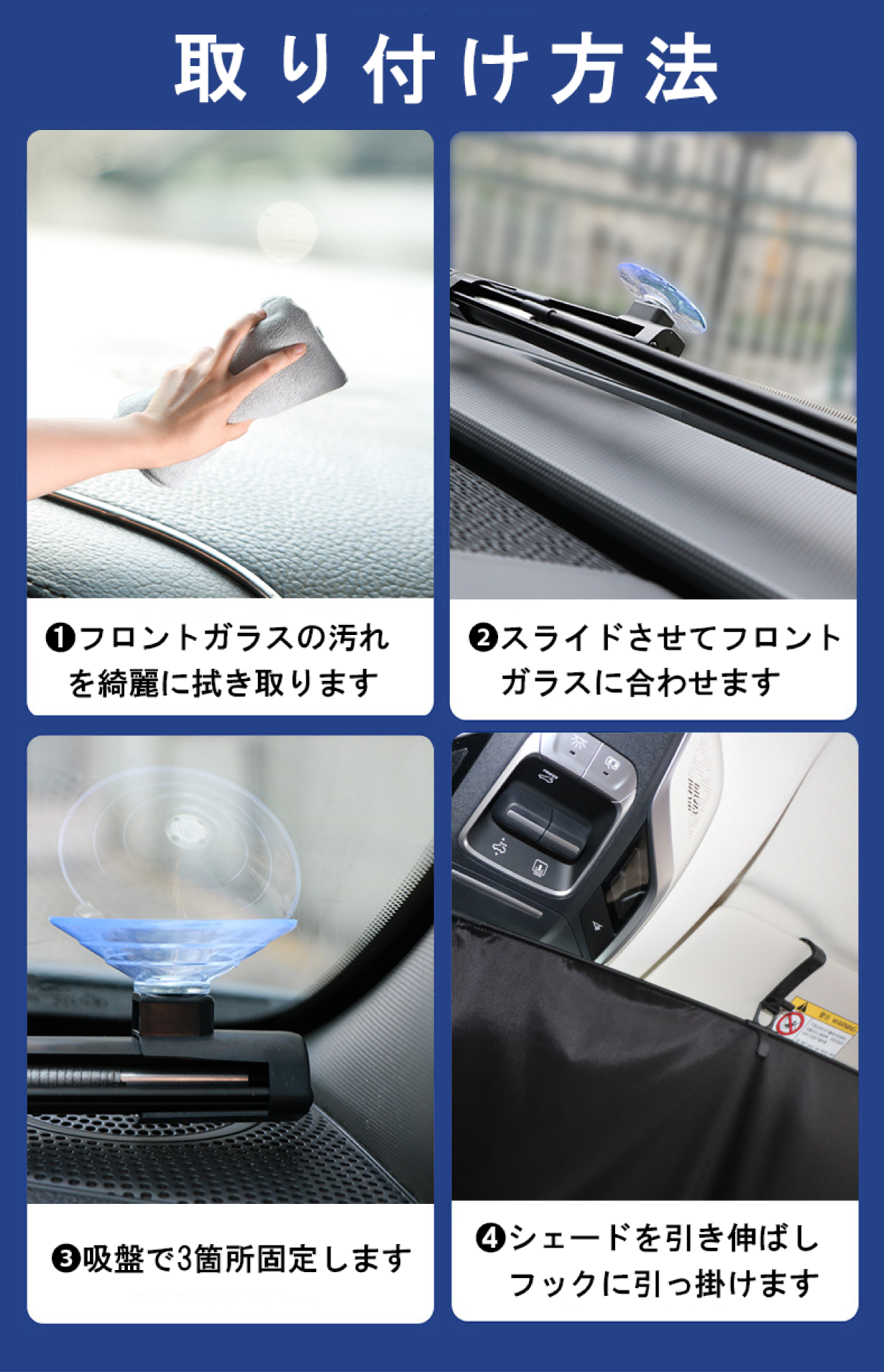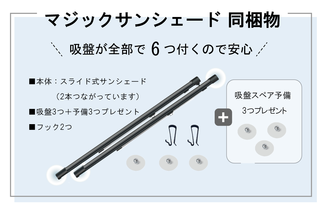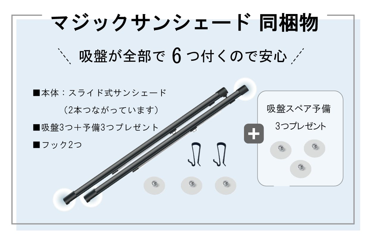 A. 車のフロントガラスのサイズに「マジック サンシェード」をスライドさせて長さをあわせたあと、3つの吸盤で固定させます。1分もあれば簡単に設置できます。