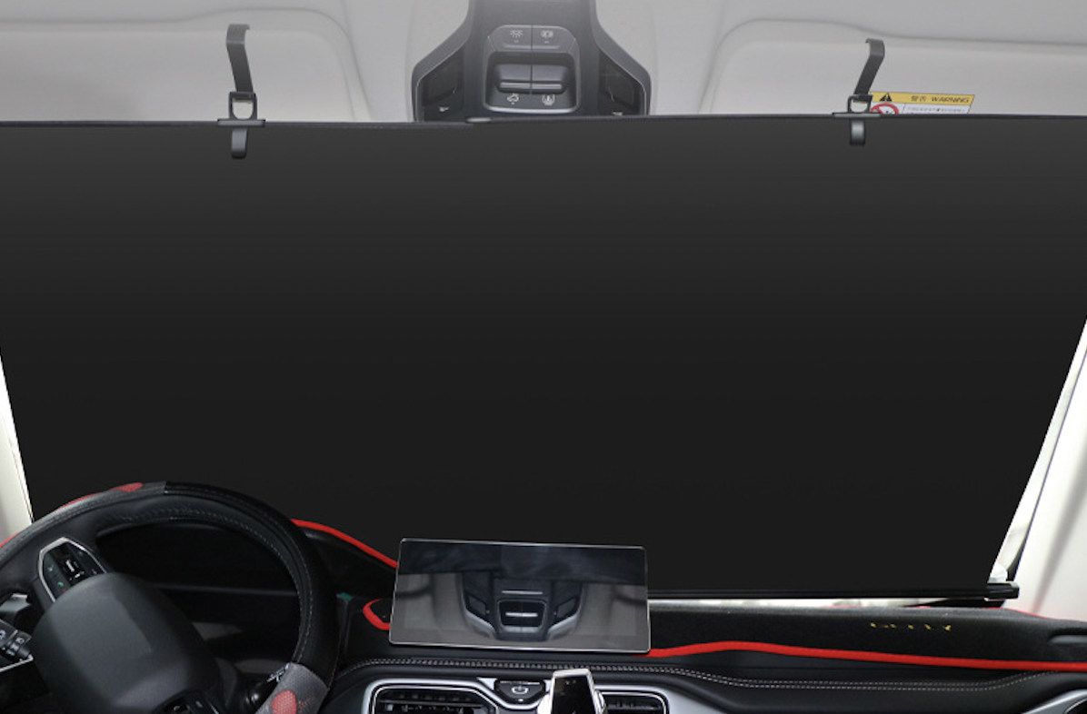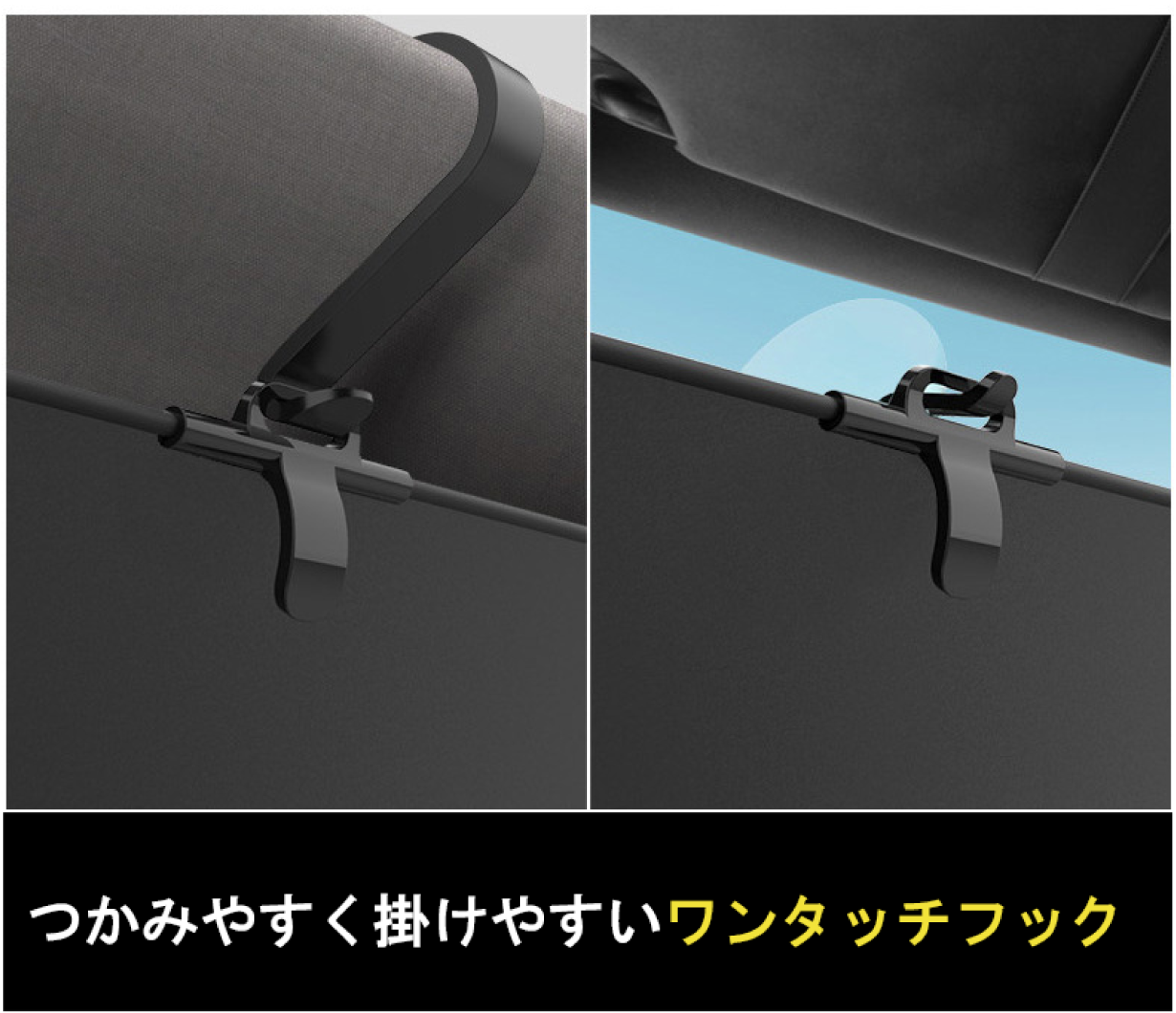 パイプから遮光シートを引っ張ったら、サンバイザーに取り付けた専用フックに引っ掛けるだけ。収納時もフックを外せば自動的に巻き取られるので超簡単。
