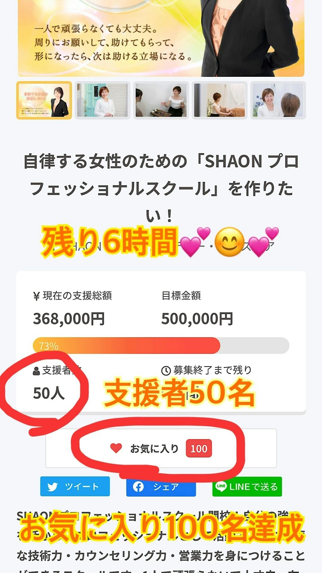2021/12/01 20:36皆さまこの度は本当にありがとうございました。初めての体験で、プロの方々にお願いしたので、分からないながらも助けて頂きながら無事に終了させて頂きました。リターンをして下さった方々!まだ御礼の連絡が出来ていない方申し訳ありません。ニックネームなどで、どなたか分かっていなくてやっとリターン表を頂いて、ビックリしています(>人<;)リターンをいくつもして下さってる方!リターン金額より多めに入れて下さってる方!もう感謝の気持ちでいっぱいです。これからきちんとリターンの御用意をさせていただきますので、お待ちくださいませ。またリターンしたけどやっぱり違うのが良かった!という方は、私のセッションや、体験コースに限り変更可能ですので、直接個人メッセージにお願いします。物と、個人スポンサーの方は、依頼しますので変更不可でお願いします。是非楽しみにお待ちくださいませ。クラファンが終わってからログインできないので直接お振込みさせてください!という方も居られました(*^_^*)今からでも追加可能ですので、お申し込みお待ちしております。改めて、皆さま本当にありがとうございました。皆さまの愛をしっかりと受け止め、女性の自律!皆さまのお力になれるスクールにしてまいります。ありがとうございました。そしてリターンに協力してくださいました皆さま!本当に感謝しております。おかげ様で、素晴らしい結果になったと感激しております。皆さま大好きです!直接お会い出来る方は会ってくださいませ!ありがとうございました! もっと見る