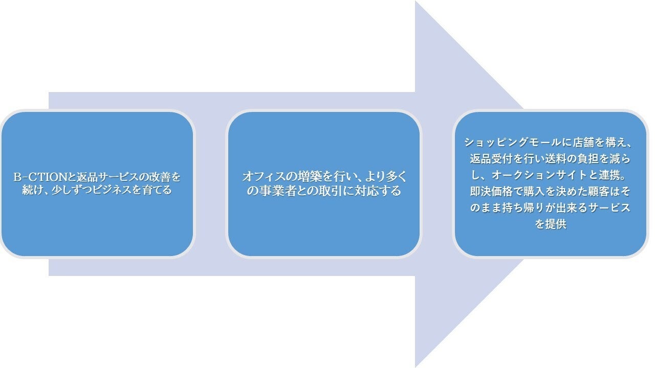 最終目標はショッピングモールなど身近なところに店を構えてECコマースで購入した商品を直接持って行って返品できる場を作ることです。