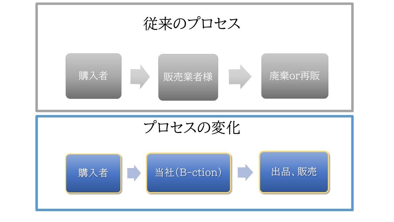B-ctionを利用していただくことにより、従来のように購入者から販売業者へと返品されそこから検品、廃棄の流れではなく、購入者から直接こちらへ返送していただくことでスムーズに再販を進めることができます。