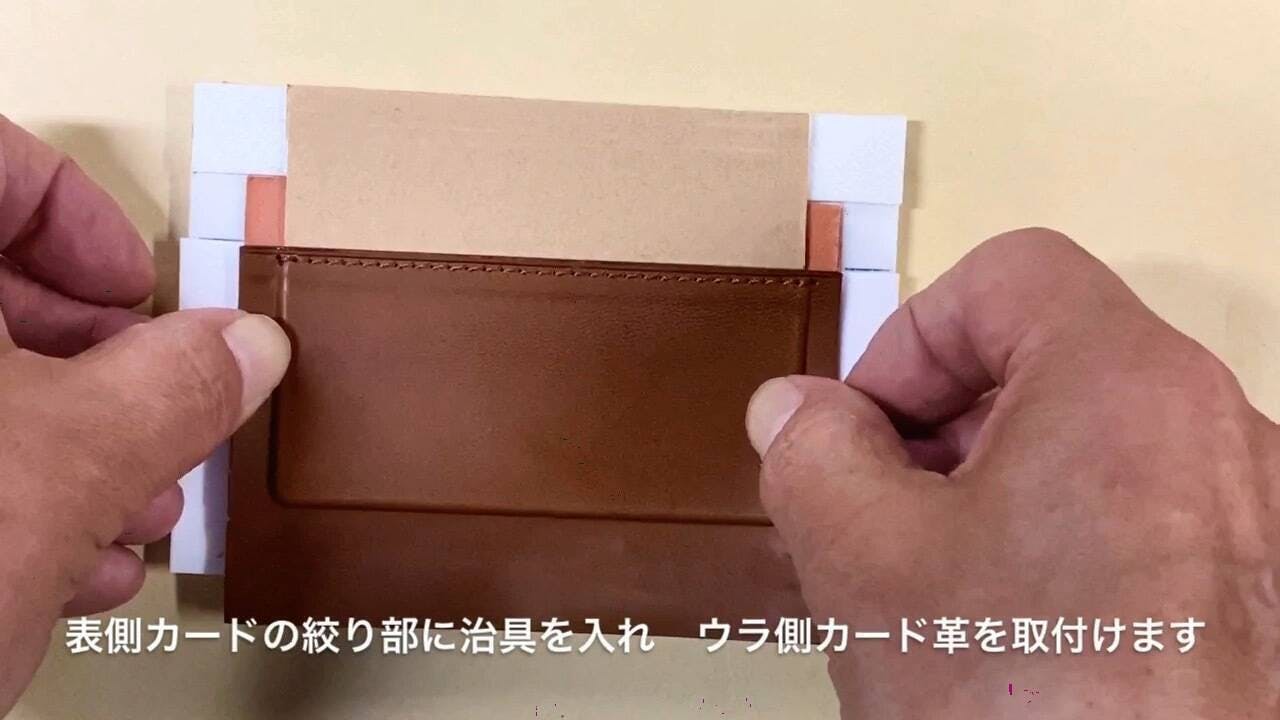 治具を使って貼り合わせて本裁断、口前を縫ってコバの面取りと削り、