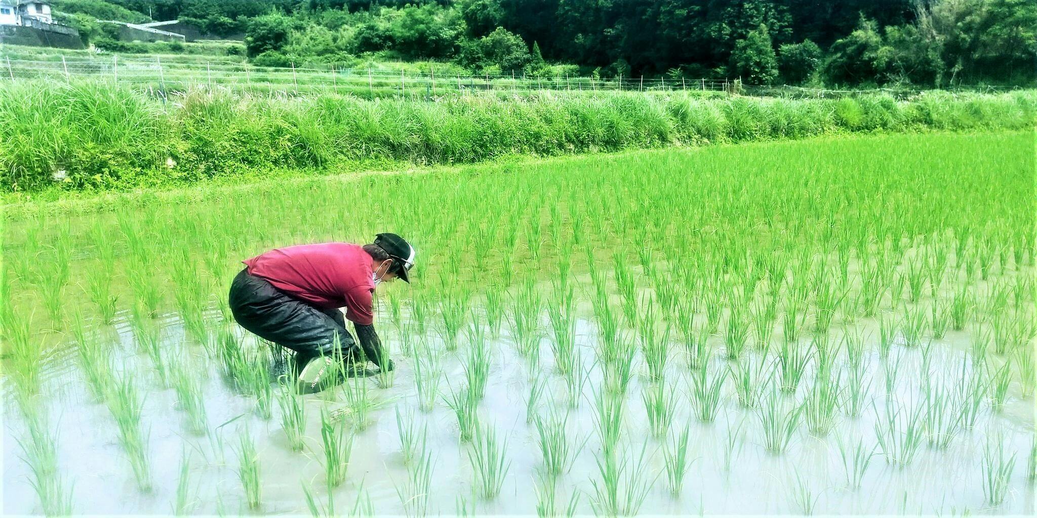 有機栽培では雑草の退治がとても大変で、時には田んぼに膝をついて、手で除草することもあり、手間を掛け、大切に育てています。