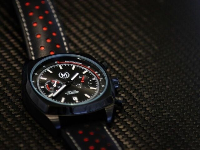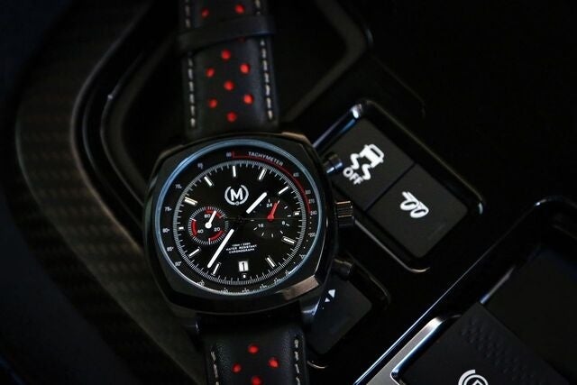 パンチング加工が施されたブラック&レッドの本革ストラップが装着されており、クラシックGTカーの革装飾やプロカーレーサーの愛用するグローブを連想させます。