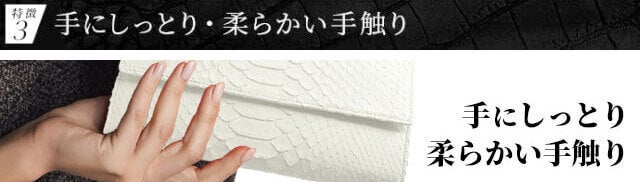 エキゾチックレザーとして今回、使用している白蛇デザインレザーは、触った感じが非常に柔らかく、ソフトで手にしっとりと馴染みます。