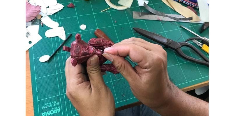 残皮であるクロコダイル革をテディベアに縫製するのは非常に難しく、開発から現在に至るまで試行錯誤の中、約1年間かかりました。