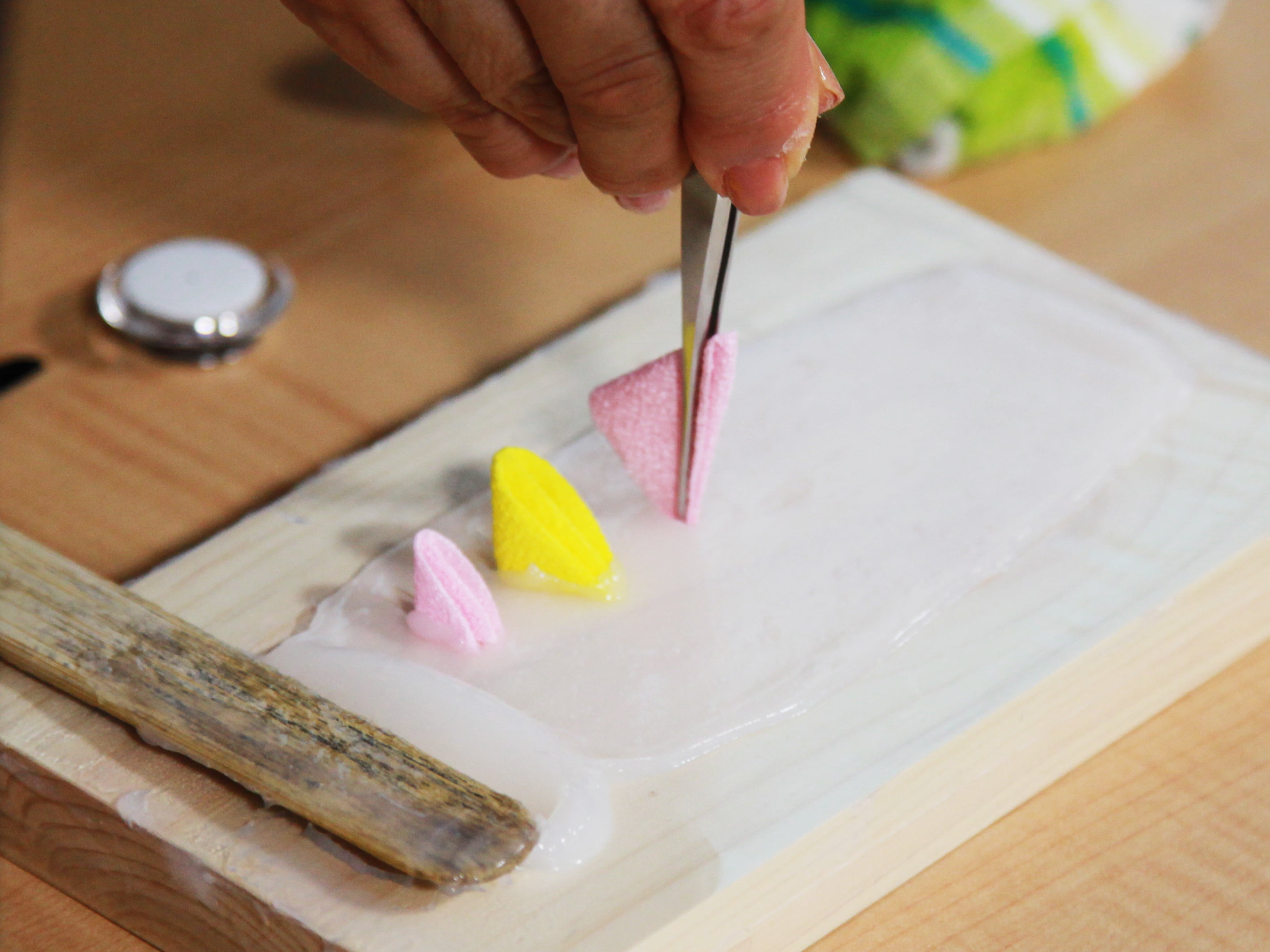 ミシンなどの特別な道具は要らず、正方形に切った布をピンセットでつまみ、糊でくっつけるだけだったのです。