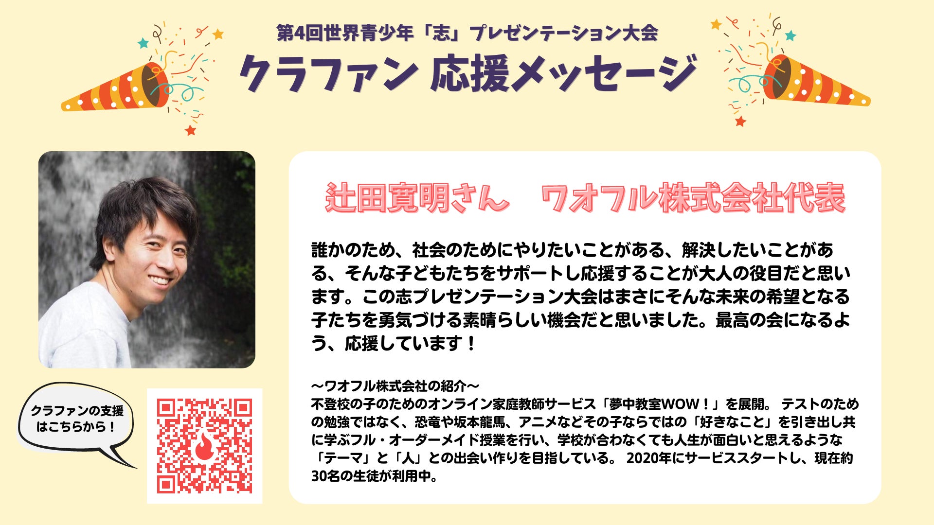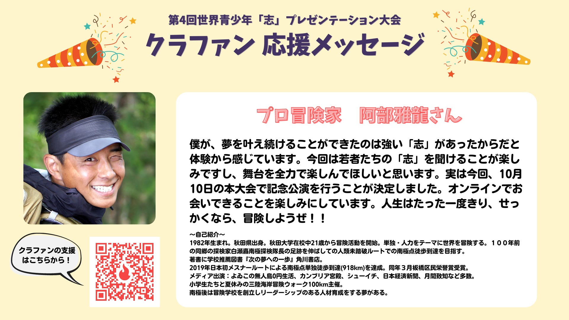 クラファン終了まで残り14日となりました。これまで、65人もの支援者、631500円もの志金(しきん)が集まっています!!10月10日の本大会も近づいてきて、大会の準備とクラファンの両立を行いながら、活動しています。さて、そんな本大会で記念講演をしていただく、ビックゲストが決まりました!!プロ冒険家の阿部雅龍さんです。実は大会の数日後に、人類初のルートで南極を目指されるそうです。そんなお忙しい中、この大会のため、子どもたちのために講演してくださります。そして、熱い熱い応援メッセージ動画もいただきましたので、シェアします。ぜひ、皆さんもこの大会に参加して、子どもたちのためだけではなく、阿部さんの活動も応援してほしいと思います。よろしくお願いします!!!!