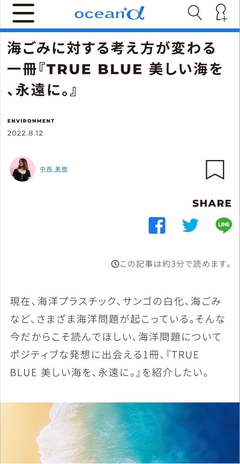 “持続可能な海を共創する”をモットーに、ダイビングや海の情報を発信しているwebメディア「ocean+a(オーシャナ)」さんに、書籍「TRUE BLUE 美しい海を、永遠に。」のことを中心に、クラウドファンディングのこともご紹介をしていただきました!