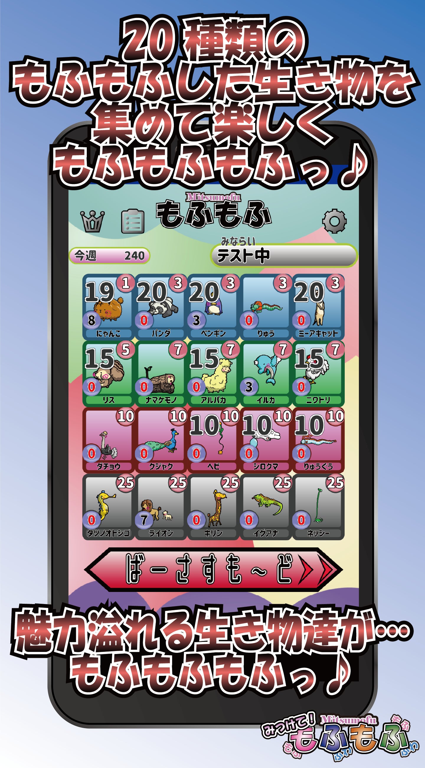 ゆるくて可愛い動物達をもふもふの中から見つけ出すゲームです。