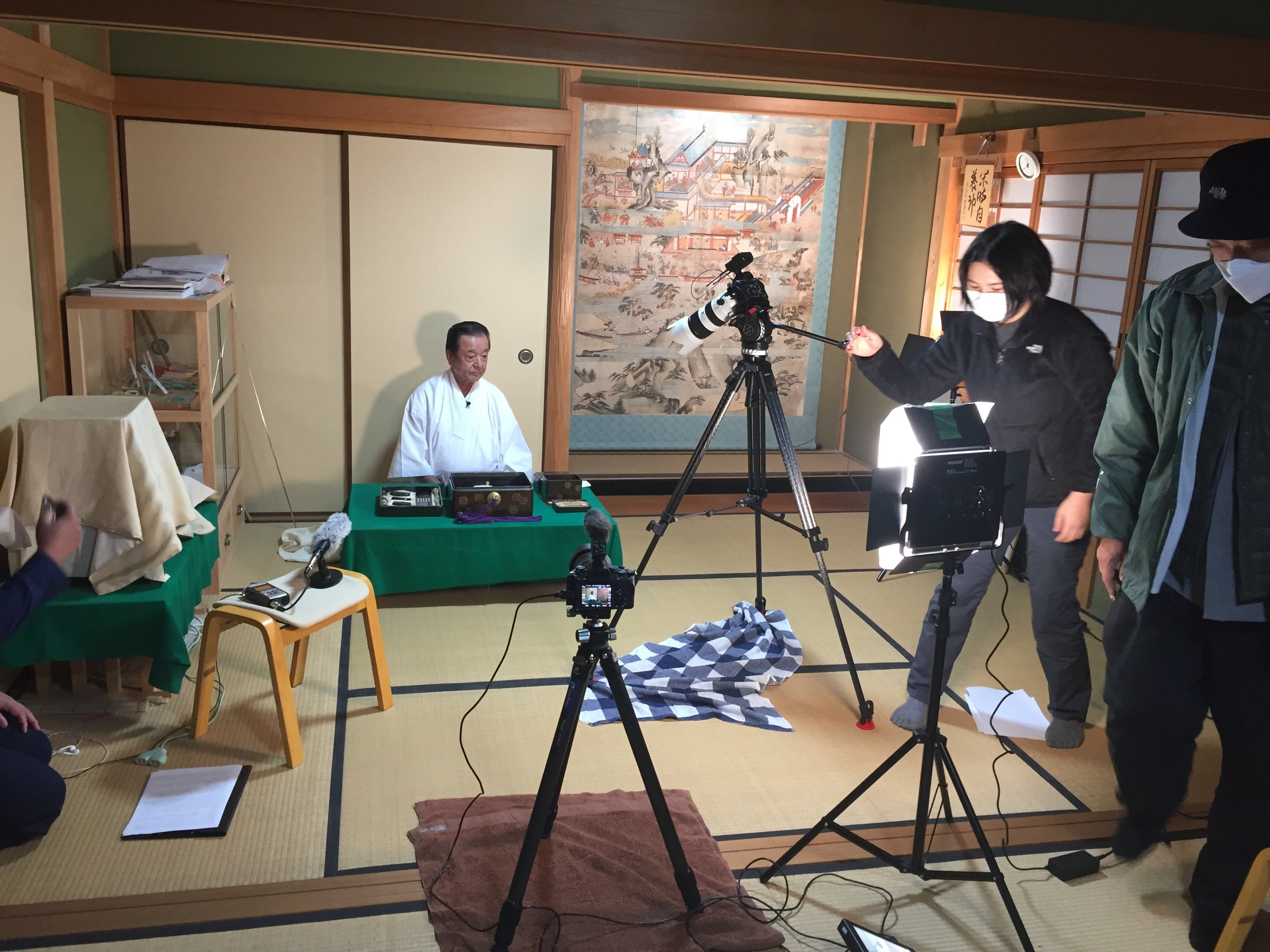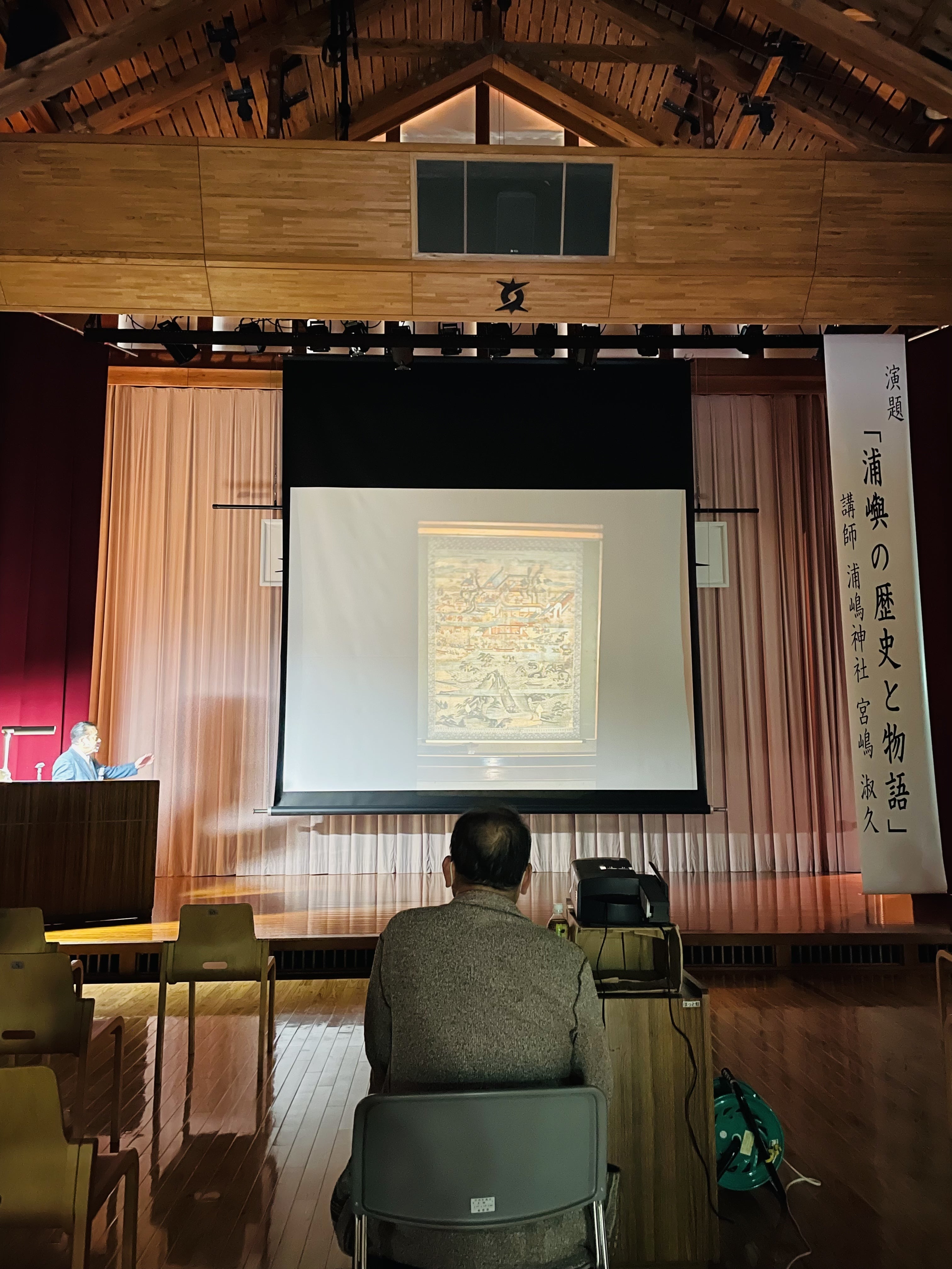 それでは宮司による講演 『 浦嶋の歴史と物語 』主催 伊根町文化協会 後半編スタートです。後半編は浦嶋子伝記に描かれた絵巻の部分にスポットを当て、そこを拡大したスライドを見ながら、当時の文化や風習を検証していきます。先ずは浦嶋子が住んでいた風景にスポットを当てたスライド。松が生える海岸の向こうには、嶋子が漁をする海が見えます。そして今も現存する雲龍山・布引の滝が既に描かれています。物語は既に始まっています。浦嶋子は漁に出るため浜に出ました。嶋子の姿を拡大して見てみます。宮司の解説によると色の付いた服を着て履物を履いている事から高貴な人物であったと予測される、と。そして船に乗り込み釣りに出かけます。細かい所まで描写してあります。特に波なんか細かく描かれていると。当時と今の地形はかなり変わっているでしょうが、日本海ですからそんなに波は当時から穏やかでは無かったかな?そんな事が理由かどうかわかりませんが、描かれた波を見る限り、今も昔も伊根湾のように穏やかな海では無かったと予測されます。しばらくして浦嶋子は五色の亀を釣り上げます。釣り上げた珍しい亀を見ている内に浦嶋子は眠ってしまい、目を覚ますと。亀の姿はなく、そこには一人の女性がいます。彼女は名を乙姫(亀姫)と言い、以前からお慕いしていました。私と一緒に、私の国で一緒に暮らしましょうと浦嶋子を誘います。そして船で乙姫の住む常世の国へと向かいます。行く途中に当時の海岸での風景が描かれています。岩場に居る釣り人と飛び交う鵜。宮司の説明では、鵜は神の使いと信じられていた。また、黄泉の国に誘う鳥とも言われていた等、諸説あるようです。こちらは海で洗濯している漁師の夫婦でしょうか?講演内容の記憶が段々と曖昧になってきてすいません。そうしている内に乙姫の住む国に着きます。浜に船が描かれている意味は、船でないと行けない国を強調しているのかもしれないとのこと。そして砂浜の向こうを常世の国として描いているのでは?との事です。常世の浜に船を着けた状況が描かれ、そしてここでも飛んでいる鵜が描かれています。そしていよいよ乙姫の屋敷に案内されます。家の者に連れて来たことを伝えて来ますのでこちらでお待ち下さいと言われて待つ浦嶋子。そしていよいよ屋敷の中へ案内されていきます。屋敷の描写から見てもかなり位の高い高貴な人物が住む屋敷と思われます。そして両親に紹介され2人は結婚することに。結婚する時の正装が描かれています。2人がいる場所はタカミヤグラ(高見櫓?)と言われている場所だそうです。そして不老不死の様々な薬を飲みながら修行もしている描写だそうです。中には葡萄酒もその中の一つにあったそうです。不老不死の薬と言えば、同じ町内の新井崎神社は不老不死を求めて渡来して来た徐福を祀る新井崎神社があります。また、屋敷の中での暮らしは優雅で時には楽団による演奏(雅楽や能)もあったのではと。確かに現在も使われる楽器が細かく描かれています。そうこうしている内に浦嶋子は両親をはじめ家の者に何も伝える事なく、長らくここに居たので一度帰りたいと申し出ます。引き留められましたが、浦嶋子の固い決心に根負けした乙姫(亀姫)は、私を忘れないようにこの玉手箱を持っていってと渡します。でも向こうでは絶対に開けないでくださいと言います。この辺りの話は現代の浦嶋太郎の話とよく似ていますね。そうして玉手箱を持って浦嶋子は故郷に帰ります。景色の変わりように戸惑いながら浦嶋子は川で洗濯している老婆に尋ねます。この辺りに浦嶋子という者の家があったと思うのだがと。聞かれた老婆は、確か300年程前の言い伝えで、浦嶋子という方が海に出たまま帰ってこなかった話を聞いたことがあると伝える。そして屋敷があったと言われている場所に向かうとそこには一本の杉が生えていました。まさかあれから300年の月日が流れていたとは信じられない。途方に暮れた浦嶋子は生家を失った悲しみと乙姫を想う寂しさから、こちらで開けてはならないと言われた玉手箱を開けてしまいます。すると中から白煙が立ち登り、乙姫のいる常世の国に誘うかのように白煙が流れていく。それを追って行く浦嶋子はみるみる内に白髪の老人となり、遂には生家のあった一本杉の元で亡くなった。話を聞いた住民達はそこに浦嶋子を祀る事にします。拡大して見ると横には酒甕が置いてありますね。こうして布引の滝の麓にあった一本杉の所に浦嶋神社が出来、創祀されるようになったと聞きます。当然、そこが浦嶋子の生家であったと言い伝えられています。以下の描写は神社で行われた祭りの様子が随所に描かれています。以上はお祭りをしている人達の描写です。お祭りを見ている人も絵巻の中に描かれています。お祭りを見に来た人達も描かれています。神社では当時の力士が呼ばれたり、中では実際に相撲を取ったりしています。現在80代