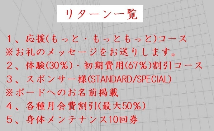 ジム内掲示のスポンサーボードに「Special thanks」として、お名前(ニックネーム可能)を掲載させていただきます。