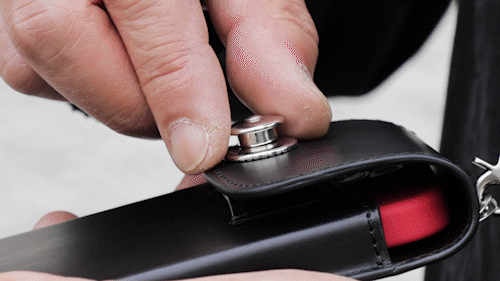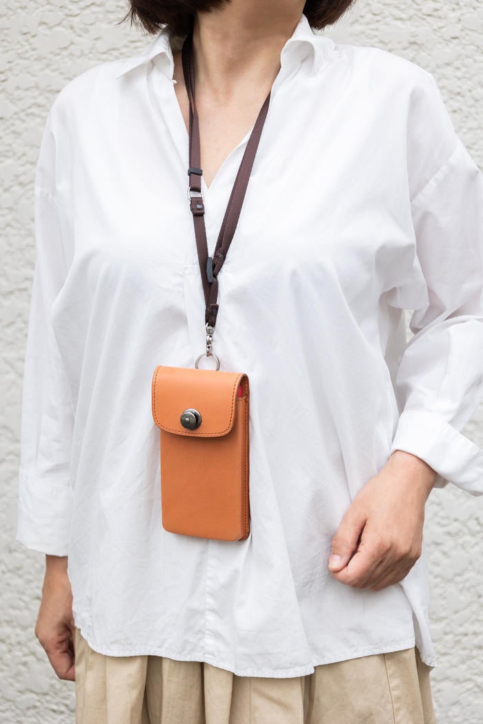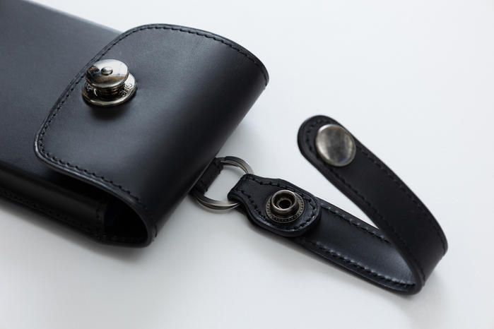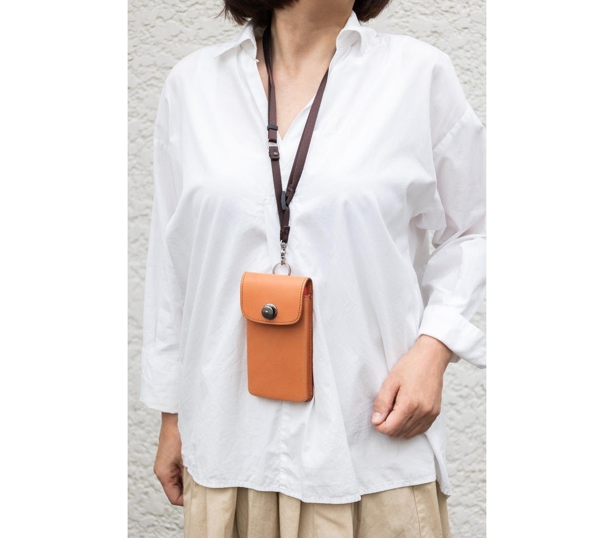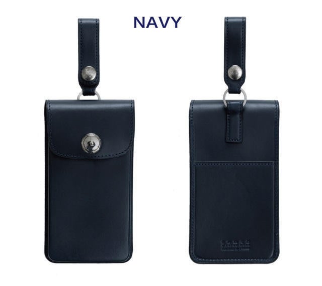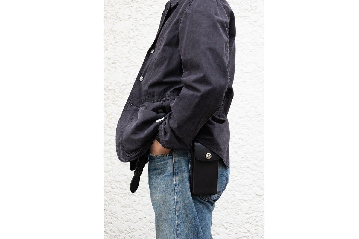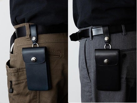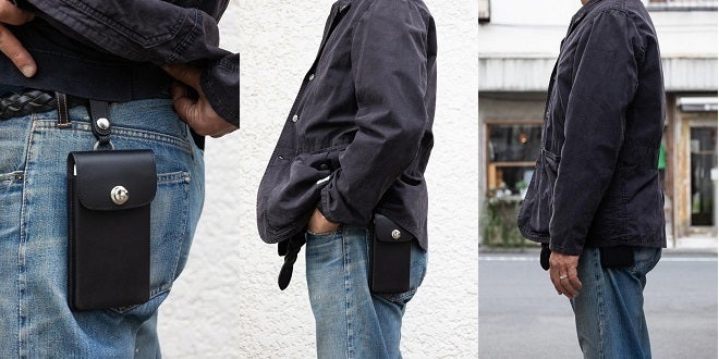 - 革のループでの吊り下げ式なので、ケースのポジションは腰より低い位置になります。これは上着を着ている時でも取り出しやすくするためです。アウターからチラッと見える様もイイ感じです。シンプルでベーシックなデザインなので、カジュアルからオフィシャルスタイルまで幅広く合わせられます。
