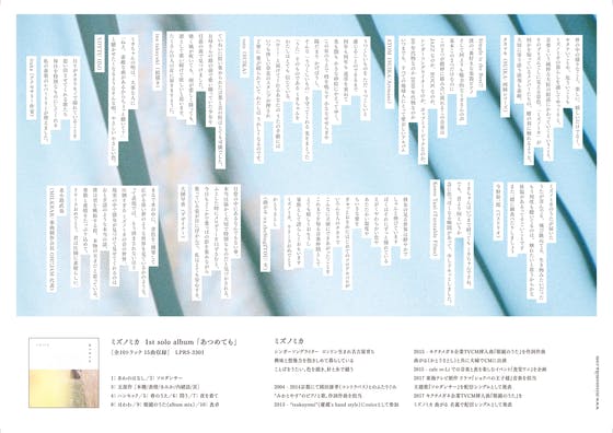 2018/05/03 15:23ミズノミカ 1st solo alubum あつめても release tour “全国で迷子2018” スケジュール更新中 5月はたくさん歌います! 5/3(木) 静岡 LIVEHOUSE UHU 5/4(金) 静岡 騒弦 5/11(金) 大分 別府 博堂村 5/12(土) 大分 山香 カテリーナの森 ※ 5/13(日) 大分 山香 カテリーナの森 ※ 5/16(水) 熊本 山鹿 アサヒ 5/20(日) 高知 音楽茶房リベルテ 5/21(月) 高知 劇場歌小屋の2階 5/23(水) 香川 高松 RUFFHOUSE 6/1(金) 大阪 心斎橋 歌う魚 6/10(日) 神奈川 横浜 B.B.STREET 出会いへの胸の高鳴りと迷子への心細さを両手に笑無名のシンガーソングライター旅に出ます 知らない土地で初めてのお店であなたがフラリと扉を開けて聴きに来てくれることがどんなに大きな喜びか。 音の鳴る場所でお会いしましょう ※5/12、5/13、この2日間は大分カテリーナの森で開催されます5/12(土) SING BIRD 前夜祭5/13(日) SING BIRD CONCERT 2018“山香聖歌隊”の一員として参加させて頂くことになりました!ご縁あって名古屋からの参加! ミズノミカとしてのライブはございません、がカテリーナの森で歌えることとてもとても嬉しいです 各日のライブ詳細はこちらをご覧くださいいろいろと、随時更新中です http://www.mizunomika.com もっと見る