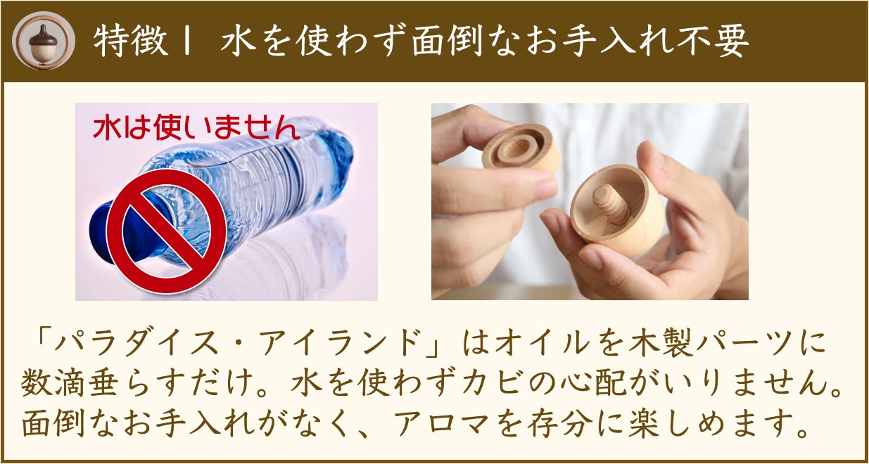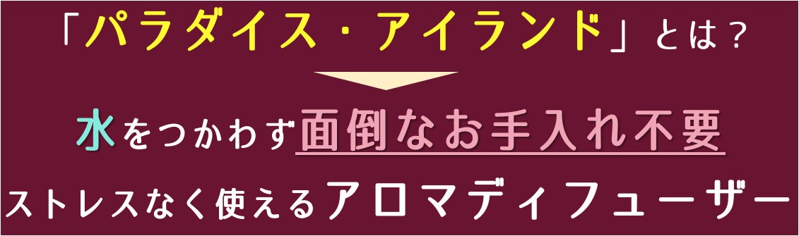 「アロマ」はせっかくのリラックスアイテムなので、お手入れのストレスがなく、毎日気軽に使いたいですよね。「パラダイス・アイランド」はそんな皆さんを、まさに「楽園の島」へ連れて行ってくれるマストアイテムなんです。