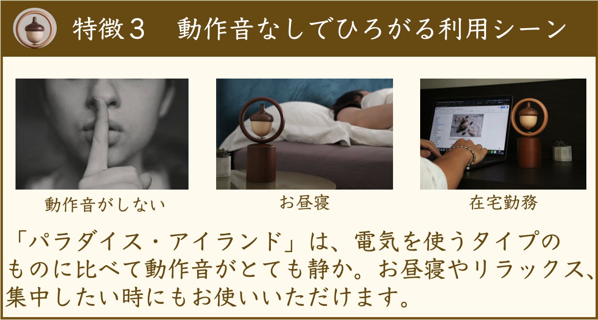 A6.本商品は水や電気を一切使わない「気化式」のアロマディフューザーです。電気や水を使う「ネブライザー式」、「超音波式」に比べると芳香力はやや下がります。電気や水を使わない分、お手入れがとっても簡単になったり、動作音がしない、など「パラダイス・アイランド」特有の特徴を実現することができています。