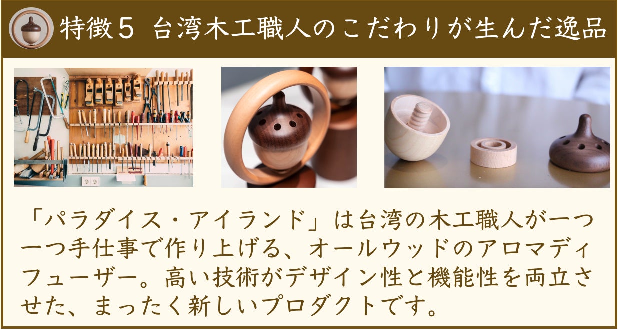 「YIXIGE」は木工産業の盛んな台湾において、50年以上にもわたり業界をリードしてきました。現社長は「お客様の日常へのさらなる浸透」を掲げ、その第一弾商品としてオールウッドのアロマディフューザー「パラダイス・アイランド」を開発するに至りました。