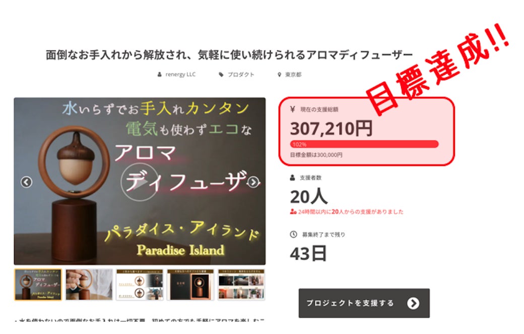ご支援頂いた皆さま本プロジェクトにご興味を持ってくださる皆さま本日20時から販売を開始し、わずか1時間あまりで目標金額30万円を達成いたしました!これもひとえに皆さまのご支援あってのものと思っています。一人でも多くのみなさんにこの「パラダイス・アイランド」のある素敵な暮らしをご体験いただけるよう、引き続き頑張ってまいります!皆さまに置かれましても、ご自身のSNS(Facebook、Instagram、Twitter等)で、本商品ページを拡散頂けますと幸いです。今後とも宜しくお願いいたします!ある・えーな 一同