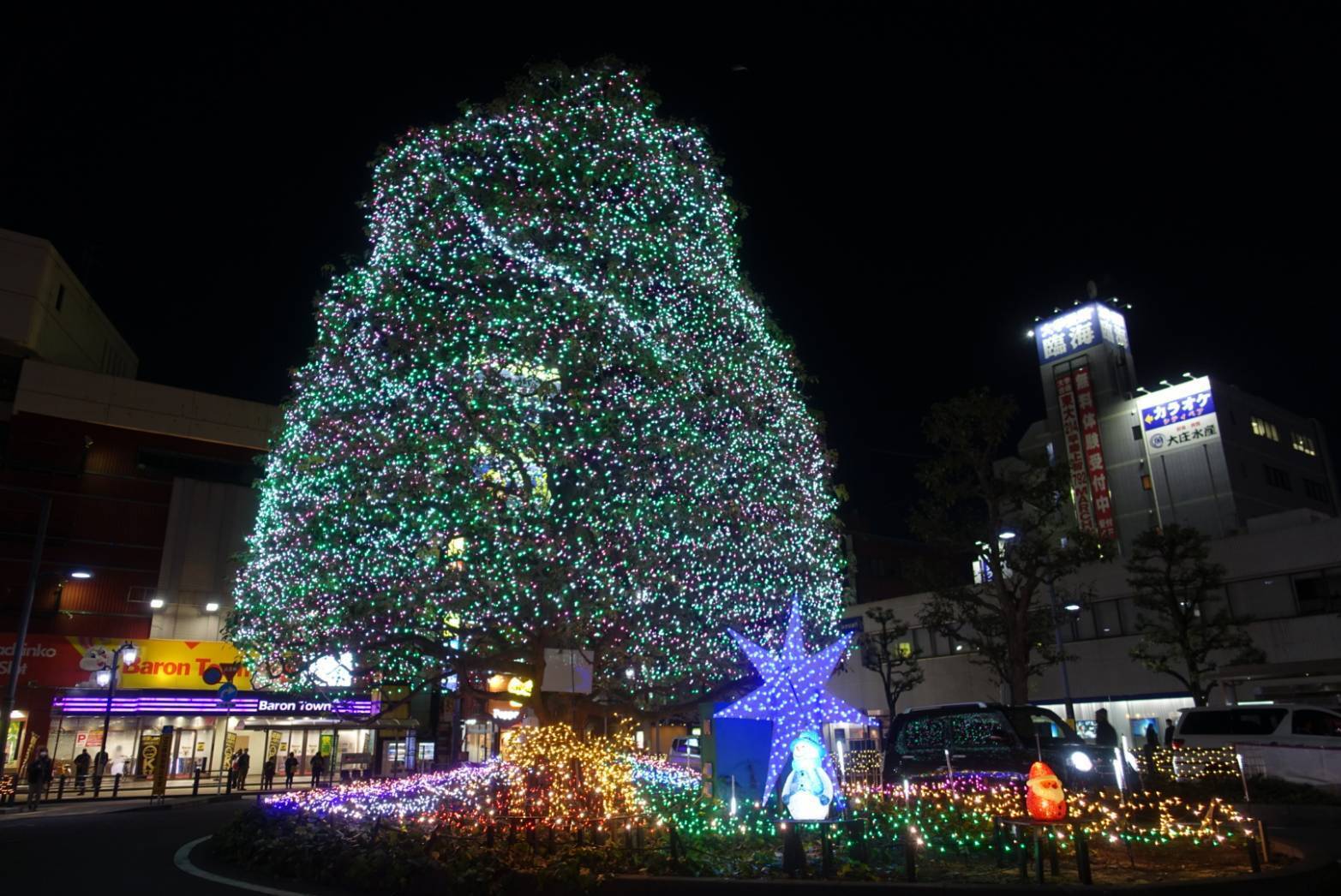 新松戸駅前を華やかに彩る、鮮やかなイルミネーション、音楽と温かい色彩で、