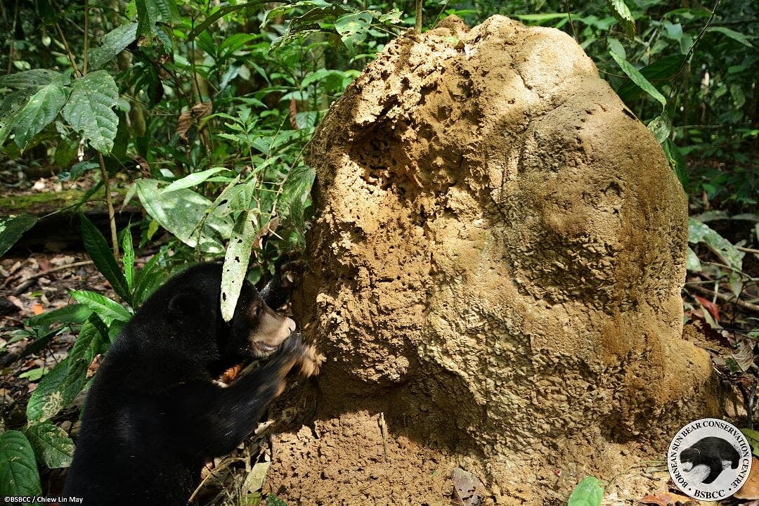 シロアリの巣を見つけると爪で崩していき、長い舌でシロアリを捕まえます。下の画像は巨大なシロアリの巣を掘るマレーグマLogan!シロアリは木を食べてしまうので、増えすぎると木々の成長を妨げてしまったり、腐らせてしまいます。なのでマレーグマがシロアリを食べることで数をコントロールしてくれています。