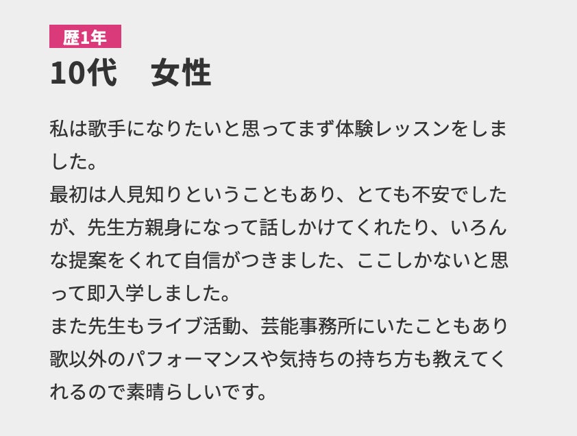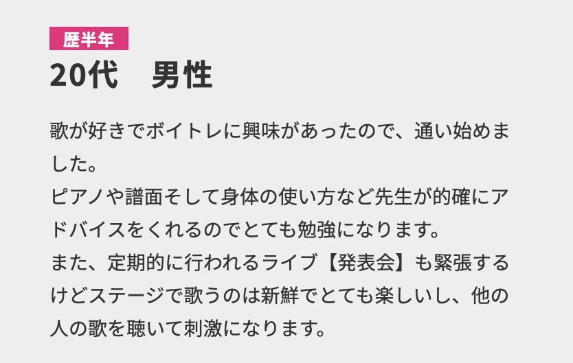 音楽を基礎から学べ、趣味での歌の上達からプロの歌手養成まで、専門に特化したボイトレスクールです。