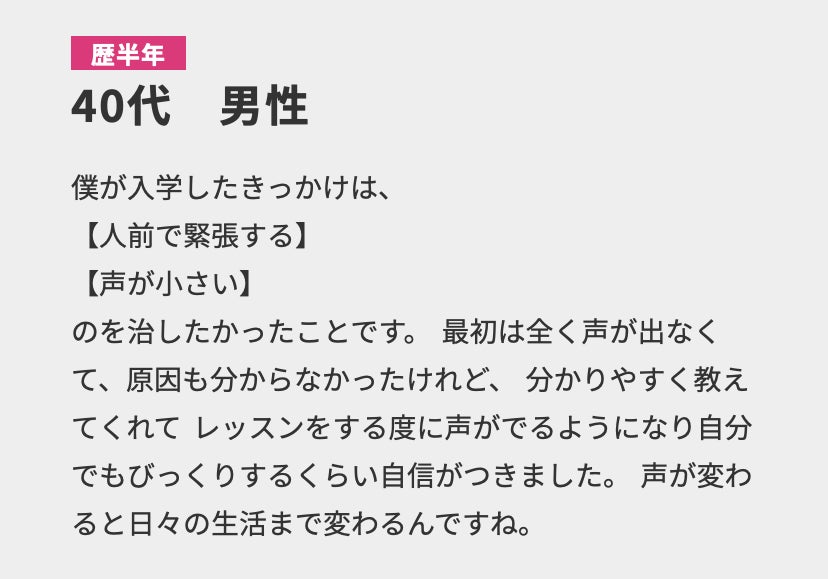愛媛県内外から生徒の通学する県内屈指のボイトレスクールで、年齢層も幼稚園児〜80代までと幅広く色々な年代の方々が交流のできるスクールです。