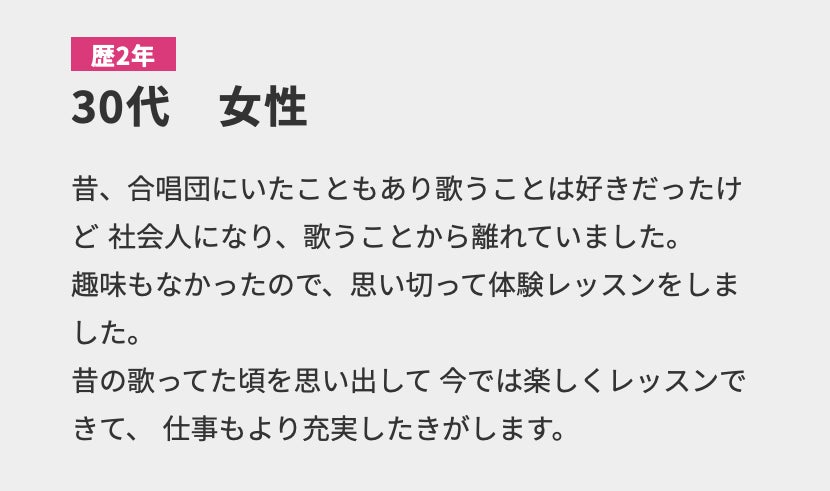 歌手を目指す若い方から、老後の生きがいとして通ってくださる方、親子やファミリーで通ってくださる方など、会いにきてくれる生徒さんがたくさんいてくださり、ありがたいことです。