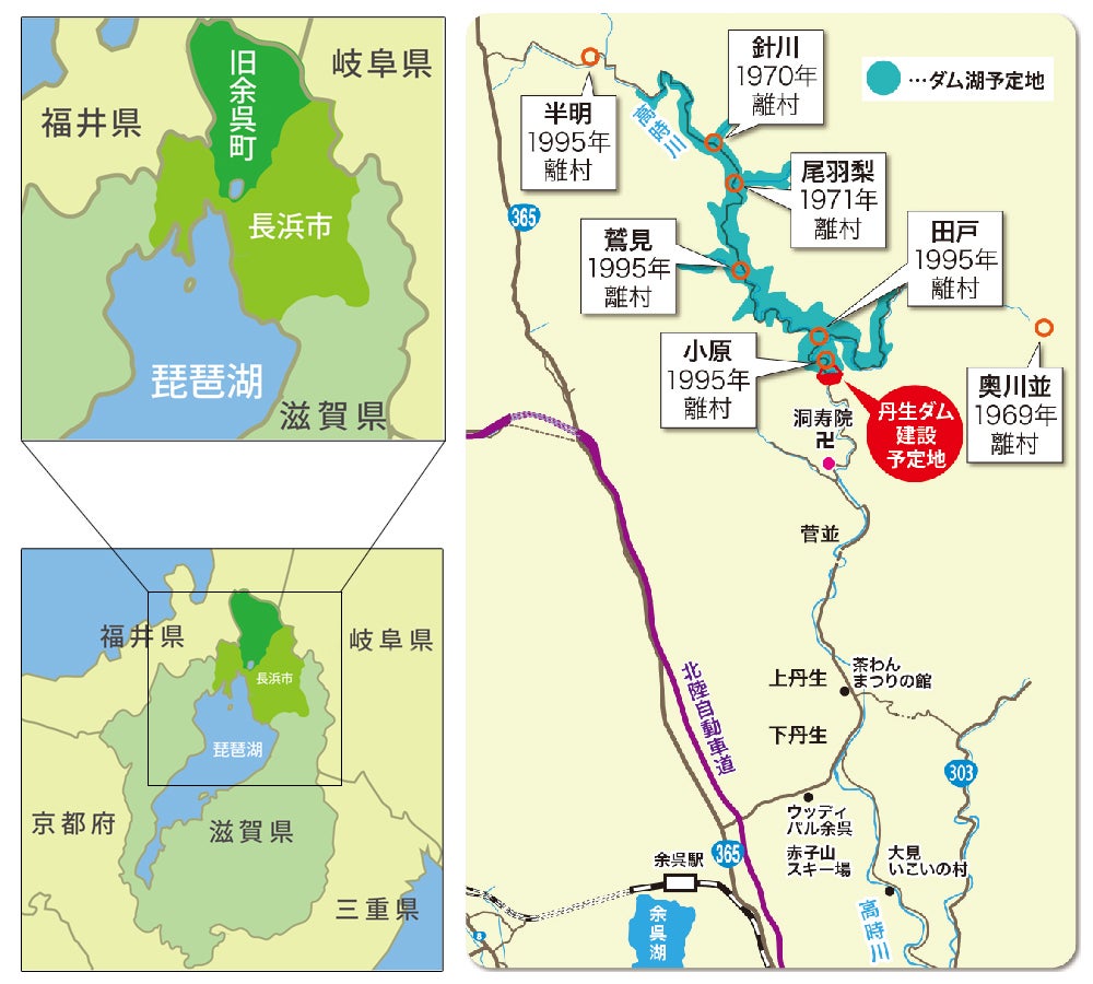 昭和40年代になると、プロパンガスや石油ストーブが普及し、木炭が売れなくなりました。時を同じくして、高時川に丹生ダム計画が持ち上がりました。1988年(昭和63)に着工予定で進められたダム建設計画を受け、1996年(平成8)までに、7つの集落から40世帯が離村することとなりました。その後、2016年(平成28)にダム建設の中止が決定されましたが、村を離れた人たちは、二度とかつての暮らしには戻れません。
