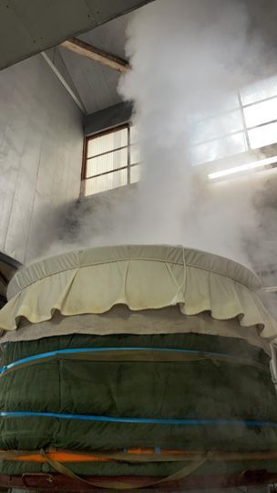 ②その後、酒米を甑(こしき)に張り(酒米を入れこみ)、蒸します。