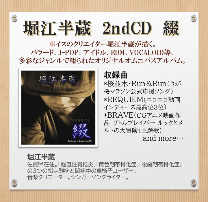 車いすの音楽クリエーター「堀江半蔵」が描く様々なジャンルの楽曲オムニバスアルバムです。