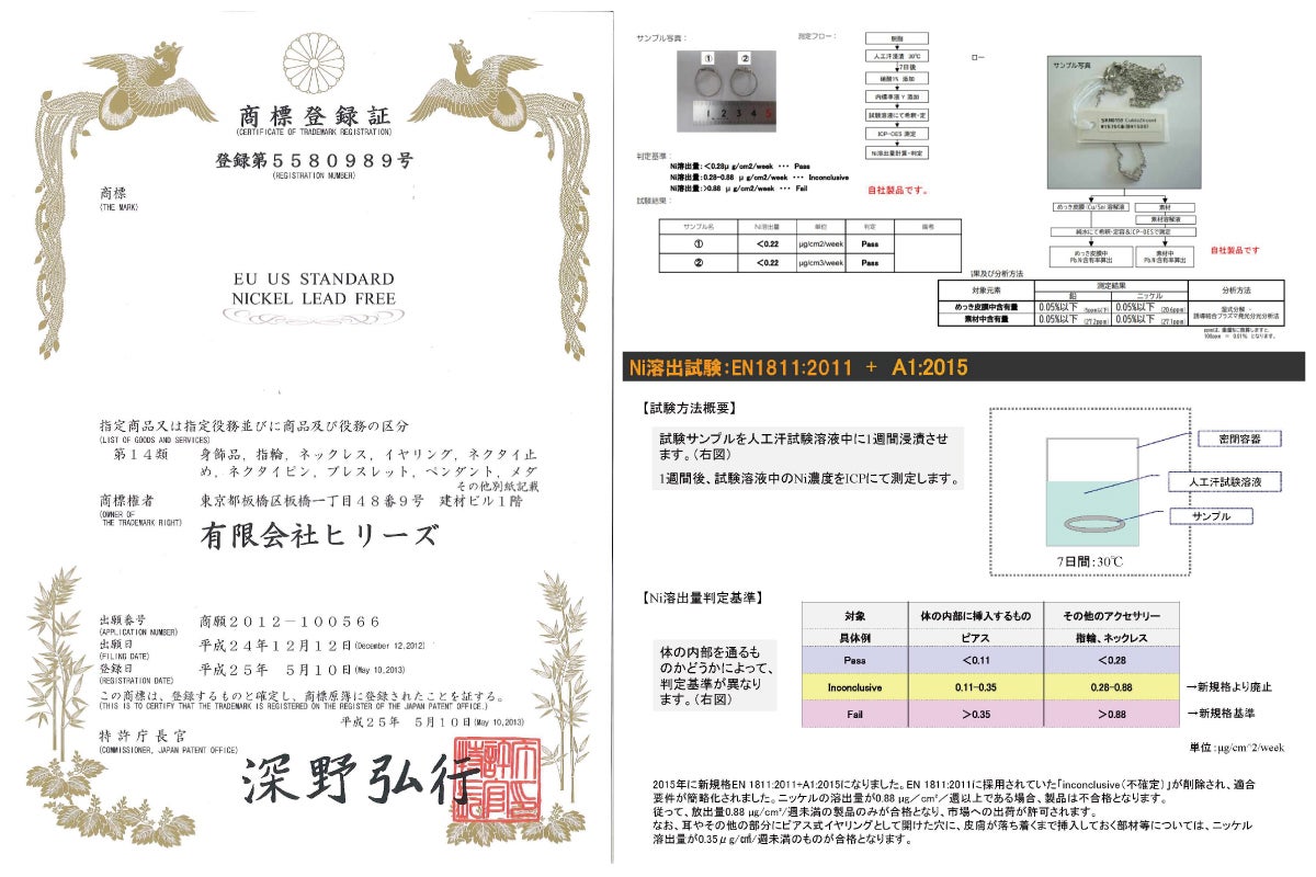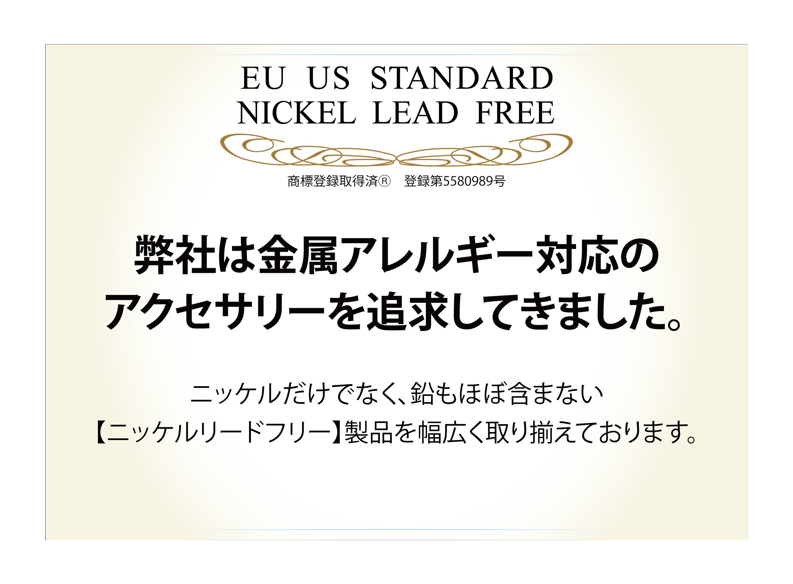 欧米諸国で法規制されている厳しい数値に準じる商品をEU US STANDARD NICKLE LEAD FREE と表記し、商標登録を取得しました 。