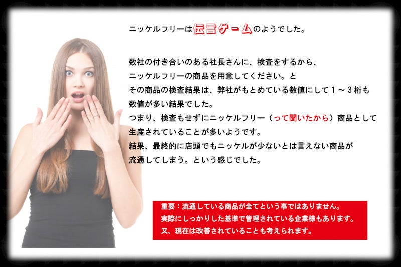 把握できてはいなかったため、ニッケルフリーとは、あえて表記していませんでした。