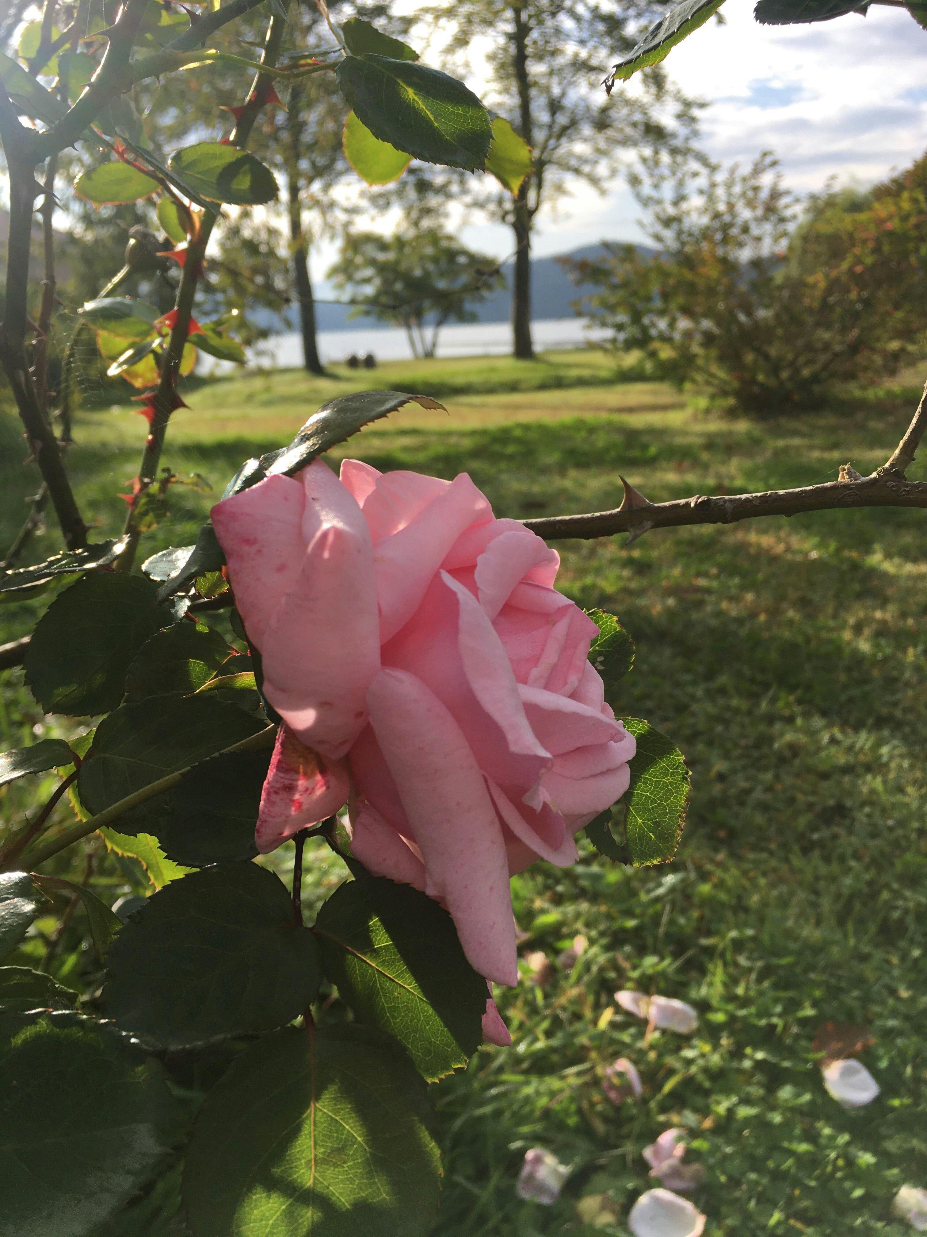 振り返ると、淡いピンク色のバラが2つ天空を仰いでいました。