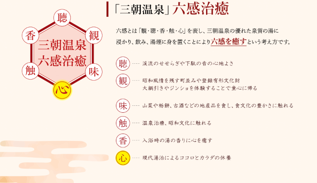 ゆったりと湯治を行うことで観、聴、香、味、触、心という六感を癒す効果があるといわれています。