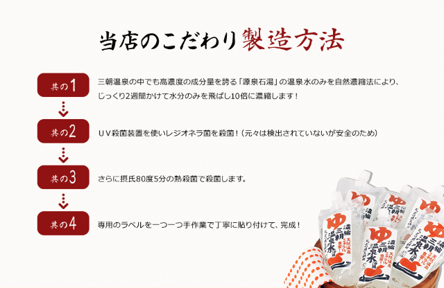 無添加・源泉100%の濃縮三朝温泉水で自宅で癒しを感じていただきたい。三朝温泉を知っていただきたい。