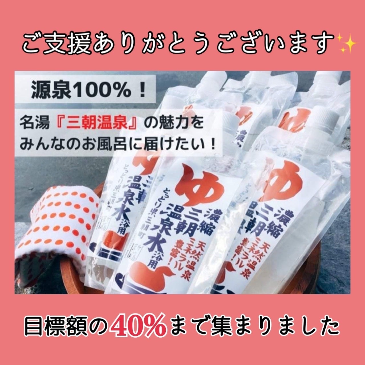 2021/11/11 17:03こんにちは!ご支援いただきましたサポーターの皆様、このページをご覧になっている皆様、ご支援、ご拡散いただき誠にありがとうございます。暖かい応援コメントがスタッフ全員の励みになっています。現在目標額の52%まで集まりました。CAMPFIREでのご支援、応援メッセージだけでなく、実際の店舗でも三朝温泉にお越しのお客様から『クラウドファンディングページ見ました!頑張ってください!』などお声掛けいただいたり、Twitterでも毎日たくさんの反応をいただき、大変うれしく思います。ぷちショップ三朝温泉には源泉かけながしの足湯もございますので日帰りで三朝温泉にお越しの方にも楽しんでいただけます。ぜひお立ち寄りください♪クラウドファンデイング残り19日!私たちの目的は1. 三朝温泉をご家庭で楽しんでいただきたい。2. 多くの人に伝え、三朝温泉を好きになっていただきたい。3. 世界へ羽ばたく商品へ成長させたい。目標まで頑張って発信してまいりますのでもう少しだけ皆様のお力をお貸しいただけますと幸いです。シェアしていただくことも支援のひとつです。こちらのページをSNSなどでシェアしていただけると嬉しいです。どうぞ、最後まで応援をよろしくお願いいたします。↓↓↓↓↓↓【名湯『三朝温泉』の魅力をみんなのお風呂に届けたい!】https://camp-fire.jp/projects/view/486914ぷちショップ三朝温泉のTwitterでも毎日発信していますのでフォローいただけると嬉しいですm(__)m↓↓↓↓↓↓ もっと見る