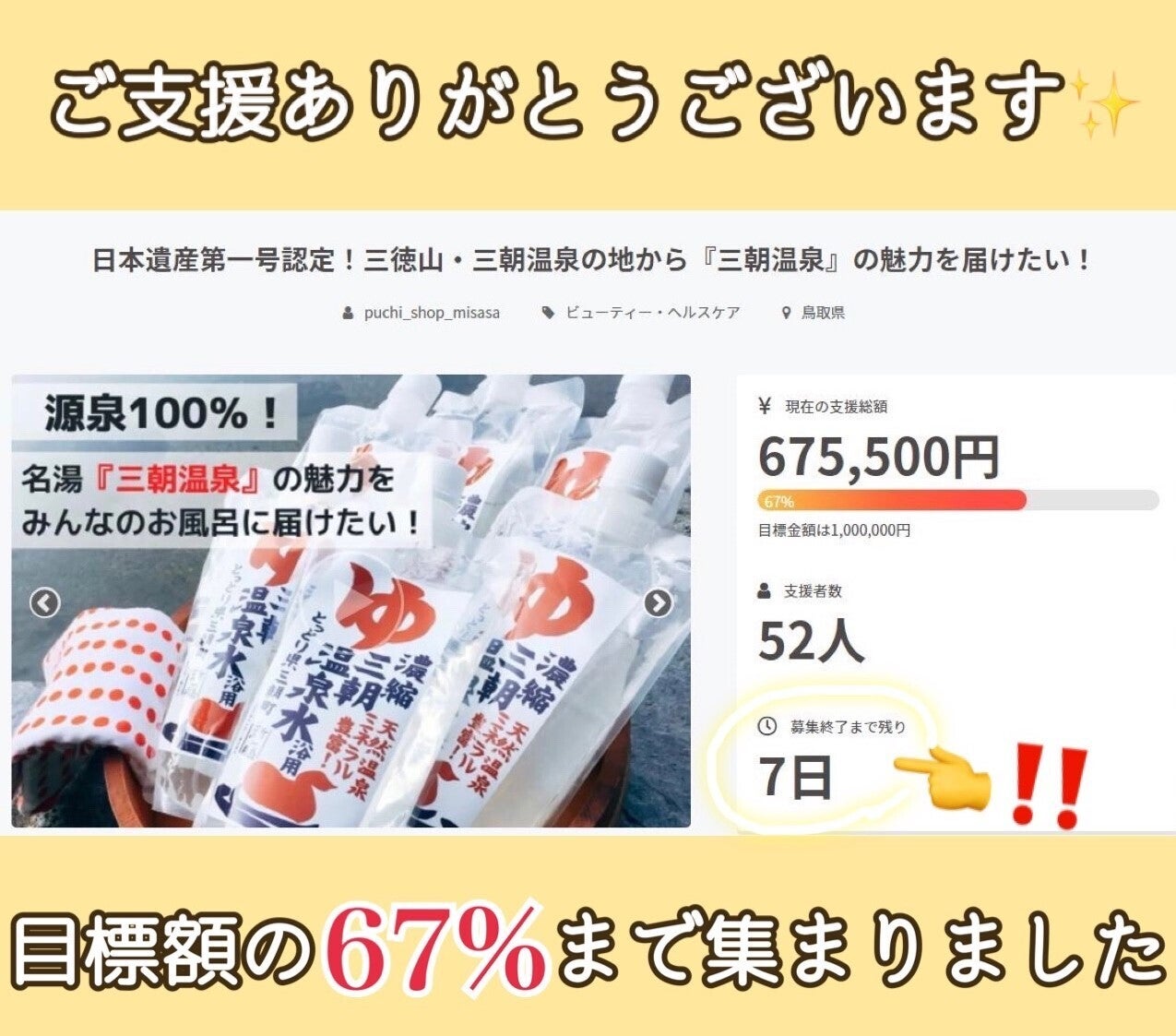 2021/11/23 14:24こんにちは!ご支援いただきましたサポーターの皆様、このページをご覧になっている皆様、ご支援、ご拡散いただき誠にありがとうございます。暖かい応援コメントがスタッフ全員の励みになっています。現在目標額の67%まで集まりました。早いもので公開も残り7日となりました。クラウドファンディングは11月30日までです!私たちの目的は1. 三朝温泉をご家庭で楽しんでいただきたい。2. 多くの人に伝え、三朝温泉を好きになっていただきたい。3. 世界へ羽ばたく商品へ成長させたい。この濃縮三朝温泉水で三朝温泉の良さを自宅でも手軽に感じていただき「実際に三朝温泉に行ってみたい」と思っていただきたい。三朝温泉のファンになっていただきたいと思っています。ラストスパートまで皆様のお力を再度お貸しいただけますと幸いです。シェアしていただくことも支援のひとつです。こちらのページをSNSなどでシェアしていただけると嬉しいです。どうぞ、最後まで応援をよろしくお願いいたします。↓↓↓↓↓↓【名湯『三朝温泉』の魅力をみんなのお風呂に届けたい!】https://camp-fire.jp/projects/view/486914ぷちショップ三朝温泉のTwitterでも毎日発信していますのでフォローいただけると嬉しいですm(__)m↓↓↓↓↓↓ もっと見る