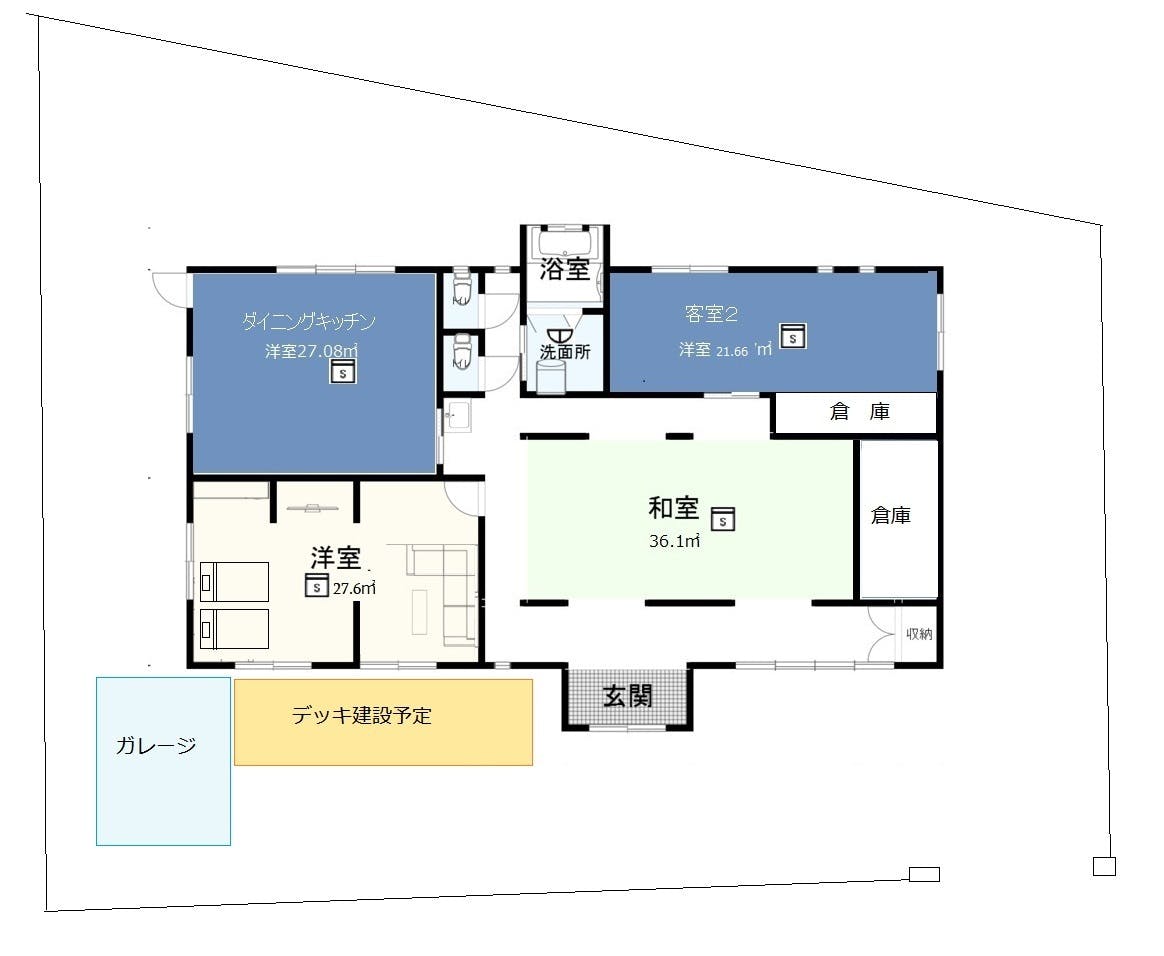 構造:木造平屋造り(洋室2、和室18畳x1、DK1,トイレ2、風呂1、屋外ガレージ)