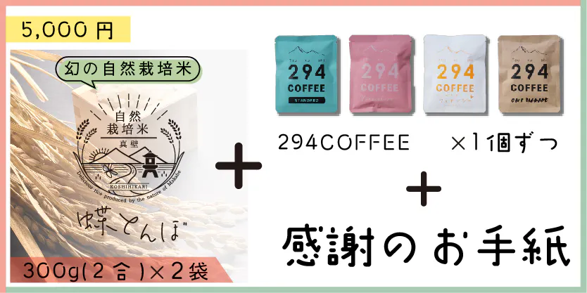 今回はその『自然栽培米コシヒカリ蝶とんぼ』1kgを2袋と294COFFEEドリップパック全種類を1つずつ試せるお値打ちセットでご用意。