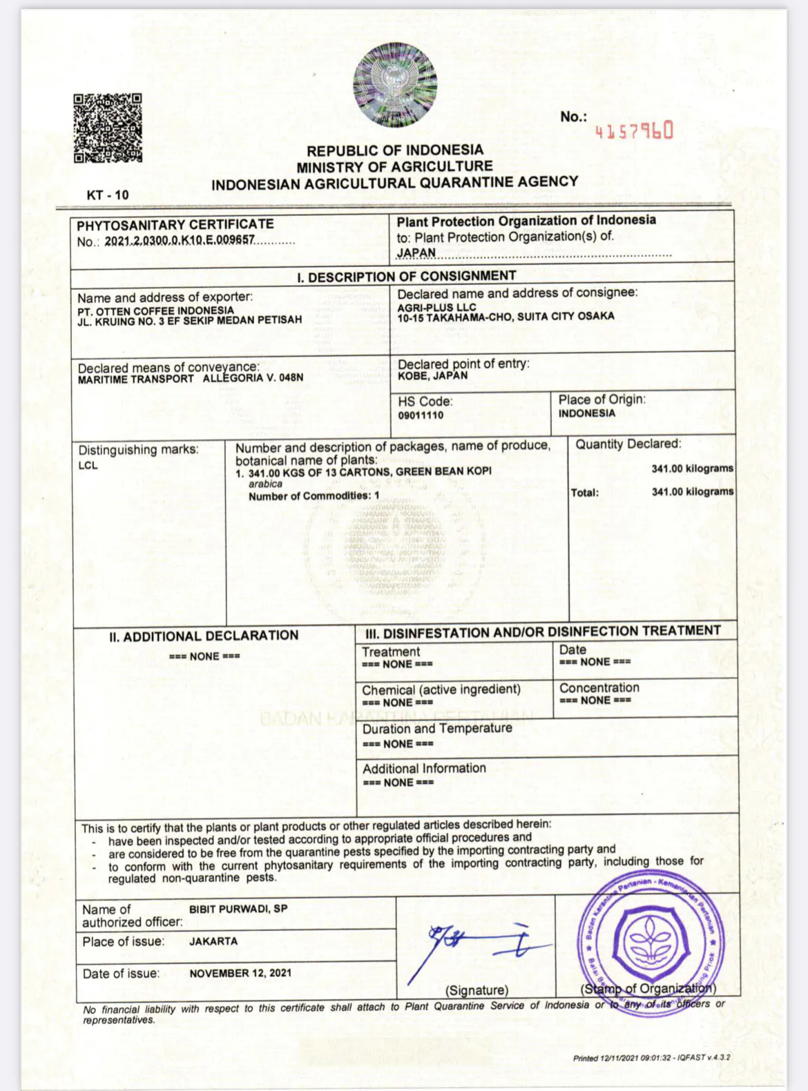 ご支援頂きありがとうございます。今回リターン商品でご用意させて頂くコーヒー豆は6日に現地を出港し神戸港に24日到着予定です。現在コロナの影響もありかなり遅れが出ているようなので少し遅れるかとは思っておりますが、しっかりと準備し美味しいコーヒーをお届けしたいと思います。写真は生豆を輸入する際に必要な植物検疫証明書です。