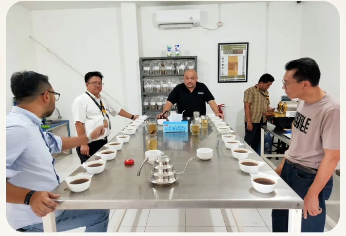 写真はインドネシアでのカッピング風景です。カッピングとは、挽いたコーヒーの粉をの上にお湯を注ぎ、4分後に上澄みをスプーンですくって味わう、コーヒーのテイスティングの方法です。