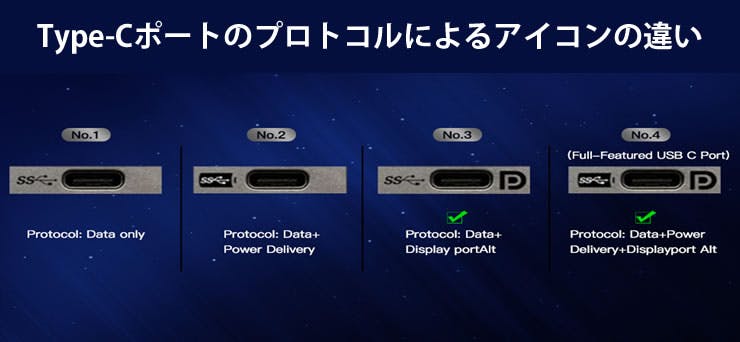 ノートPCのUSBCインターフェースについては、以下のプロトコルアイコンの写真と仕様を参照してください。