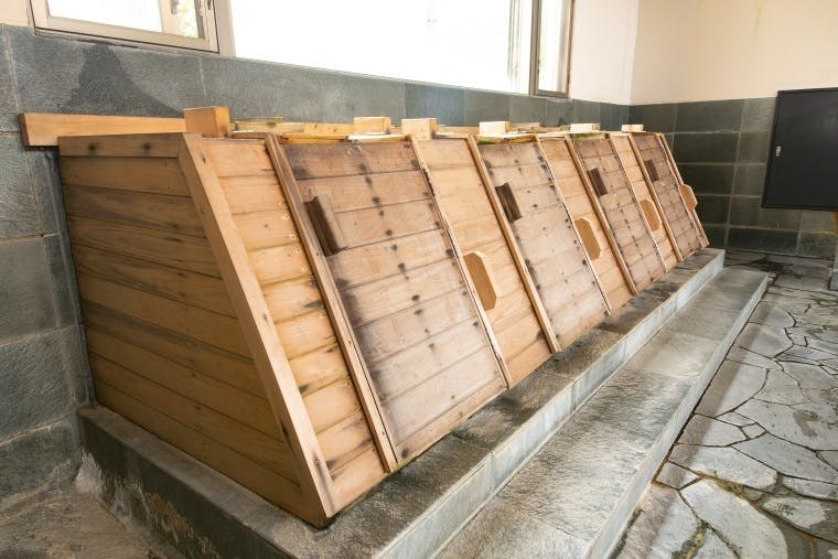 ※2.箱蒸し…飛騨の優れた檜を使った箱むしは、箱の中に座ってから首から上だけを出すサウナです。