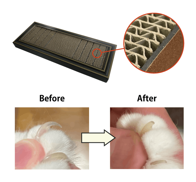 そこで、猫の習性である「爪とぎ」を利用して、自然に爪を削ることができる方法を考え、試行錯誤を重ねて、爪とぎをしながら自然に「爪が削れる機能がついた爪とぎボード・bibi Nyan 」 を開発することができました。