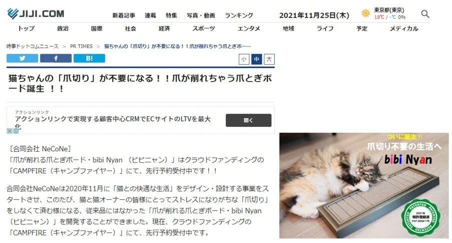 先日、プレスリリースを配信したところ、JIJI.COM様のニュースに掲載いただきましたので、お知らせ申し上げます。
