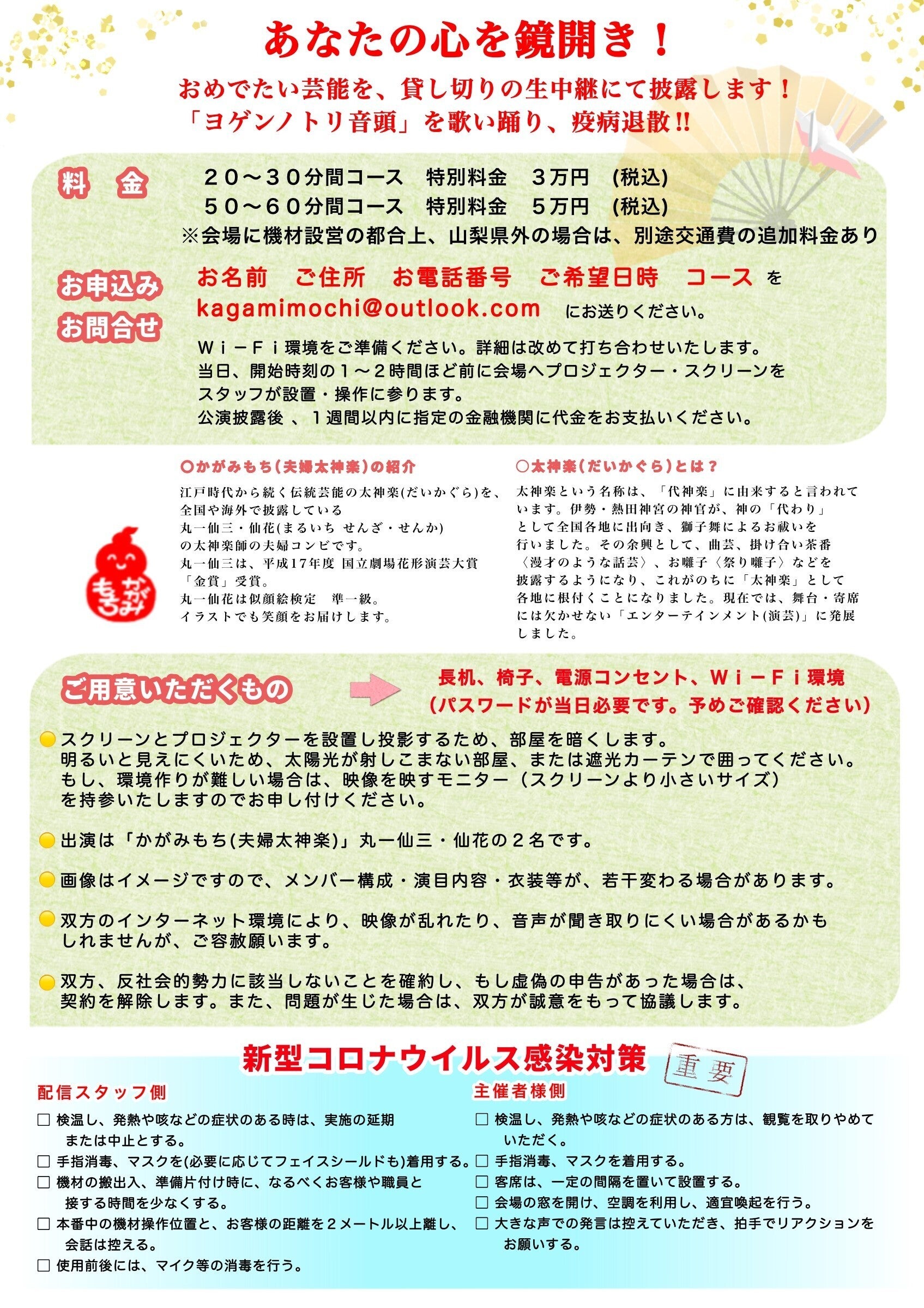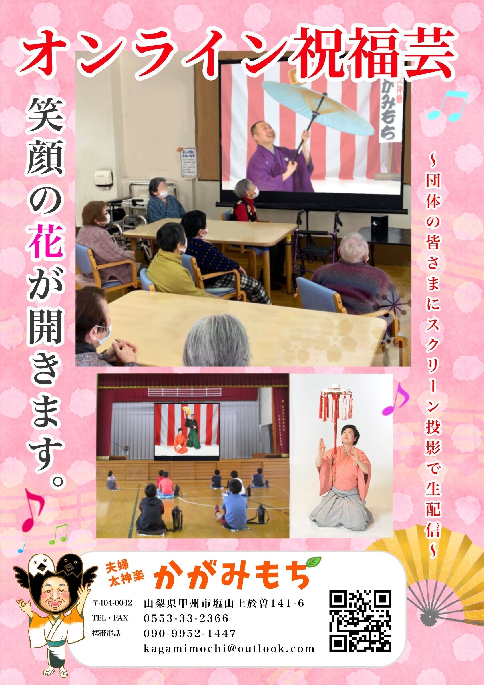 コロナ禍に、福祉・医療施設・学校さん等で、お祭りや敬老会・納涼会などで親睦を深めたり、芸術鑑賞会を行う機会のある皆様!おめでたい芸能を双方向 1対1の生中継をし、貸し切りでスクリーンを通して披露。