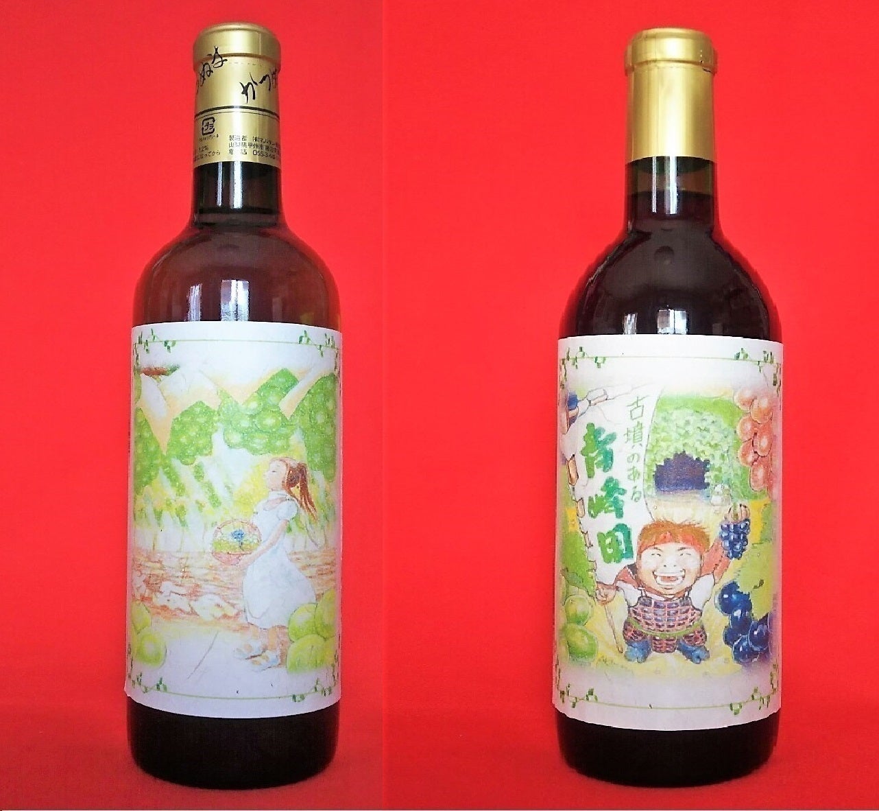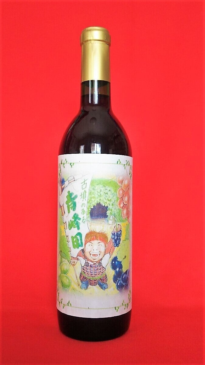山梨県甲州市勝沼町の「青峰園(せいほうえん)」で、今秋に収穫したブドウ〈マスカット・ベリーA〉を委託醸造して作った、オリジナルワイン!瓶のラベルには、赤い鎧の園主が古墳の前でブドウと幟を持ち、いざ出陣する楽しいイラストを、丸一仙花が描きました。これに「かがみもち(夫婦太神楽) サイン入りブロマイド&千社札(非売品)」を加えた3点セットです。