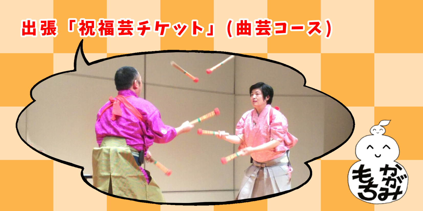 お祭り・結婚披露宴・敬老会・学校公演などのイベントで、ご指定の場所へお伺いして、おめでたい芸能を披露する予約券です。傘の上で升を回して人生末広がり、三味線や踊りであなたの心を鏡開き~。江戸時代から続く祝福芸。「ヨゲンノトリ音頭」を歌い踊り、皆様の家内安全・商売繁盛・無病息災・疫病退散を祈ります!