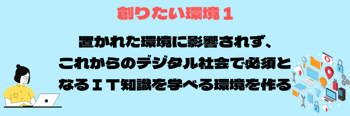①置かれた環境に影響されず、これからのデジタル社会で必須となるIT知識を学べる環境を作る