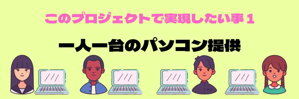 ① 高校生を対象に1人1台のパソコンの提供を行います。(目標額に達しなかった場合は、その時の金額で用意できるだけのパソコン数になります)